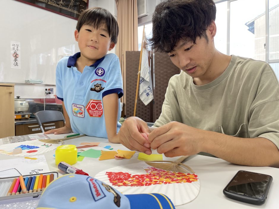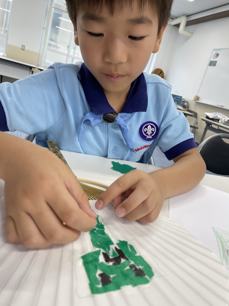 折り紙をちぎって、団扇に思い思いのちぎり絵を描いてみよう。隊長と副長が、ちぎり絵の作品の例を、インターネットで公開されている作品を参照しながら画面に映してくれて、作り方を教えてくれたね。