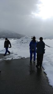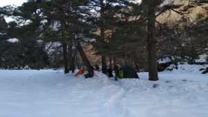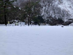キャンプ場まで雪をかき分けながら歩きようやく到着。100m歩くのに約10分かかりました。