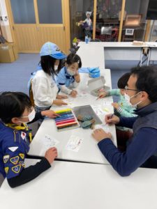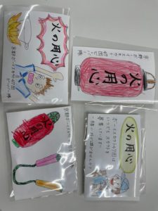 まずは、火の用心を啓発するミニポスターに色を塗り