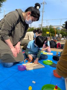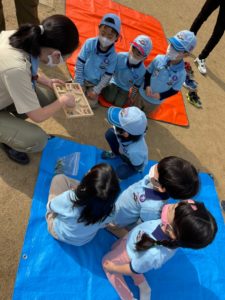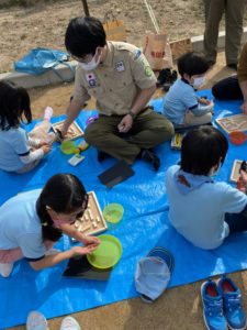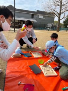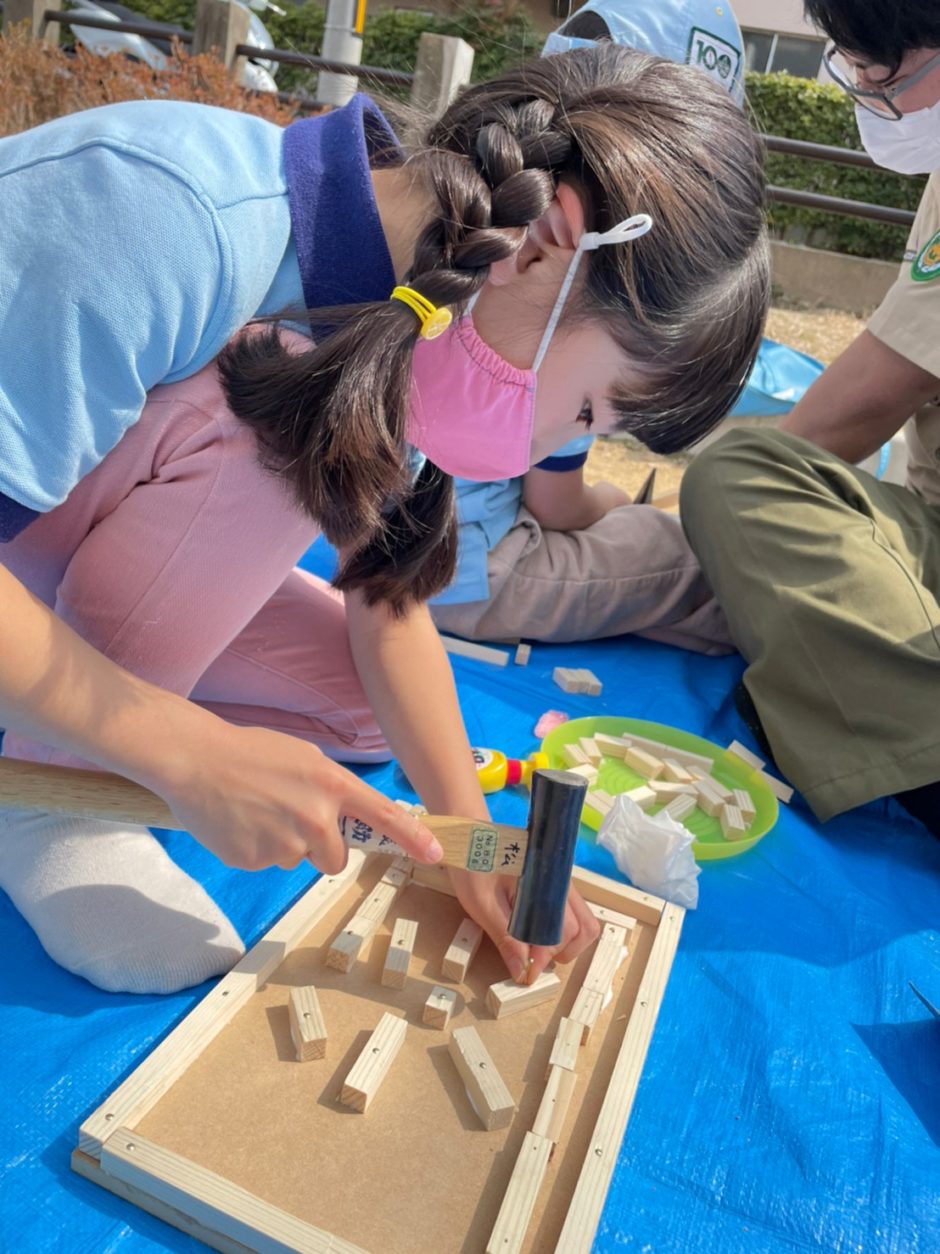 短い木を台に打ち付けて、ビー玉迷路を作りました