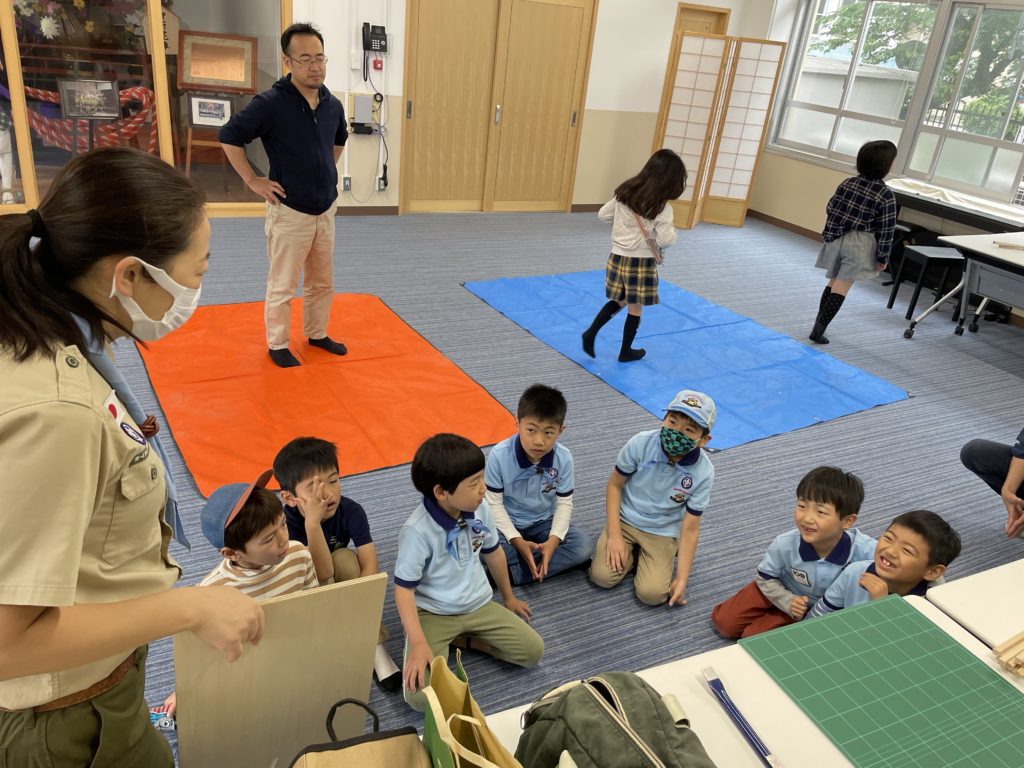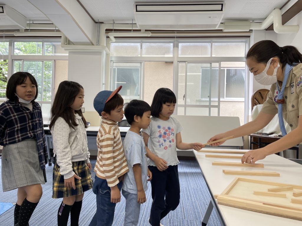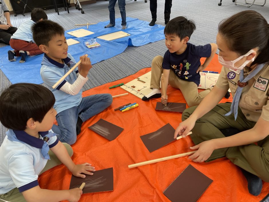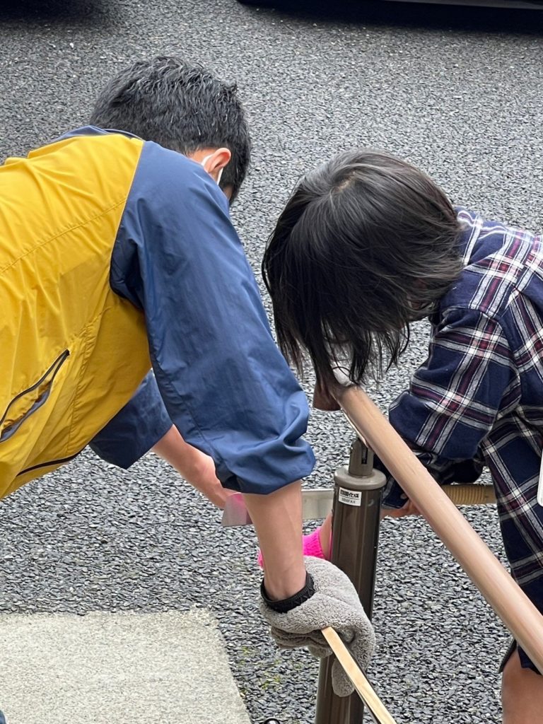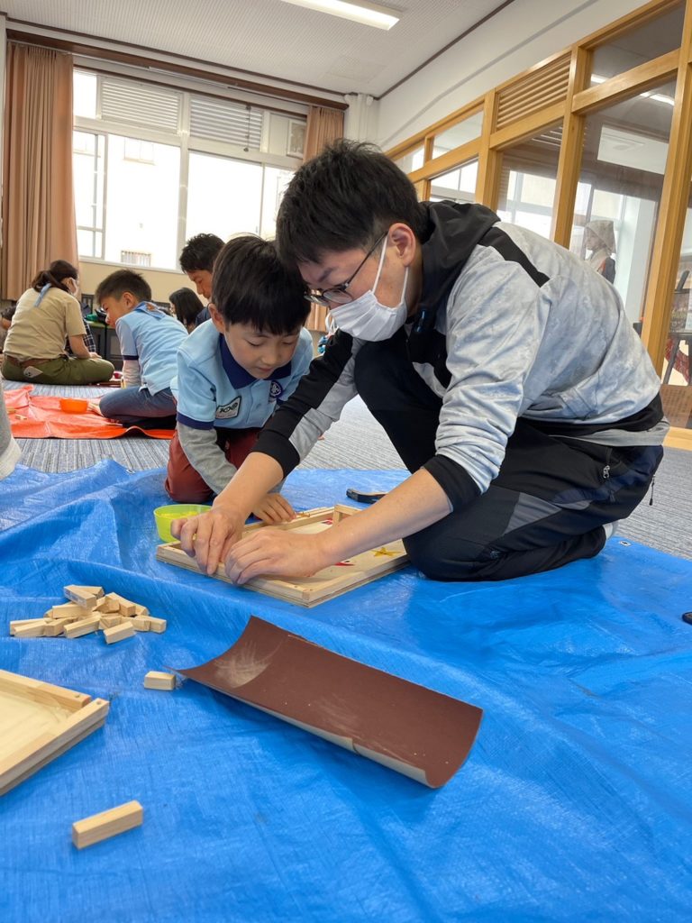 お姉さんに教えてもらったり、一緒にボンドをつけてみたり、わいわい、がやがや、力を合わせてやってみよう。