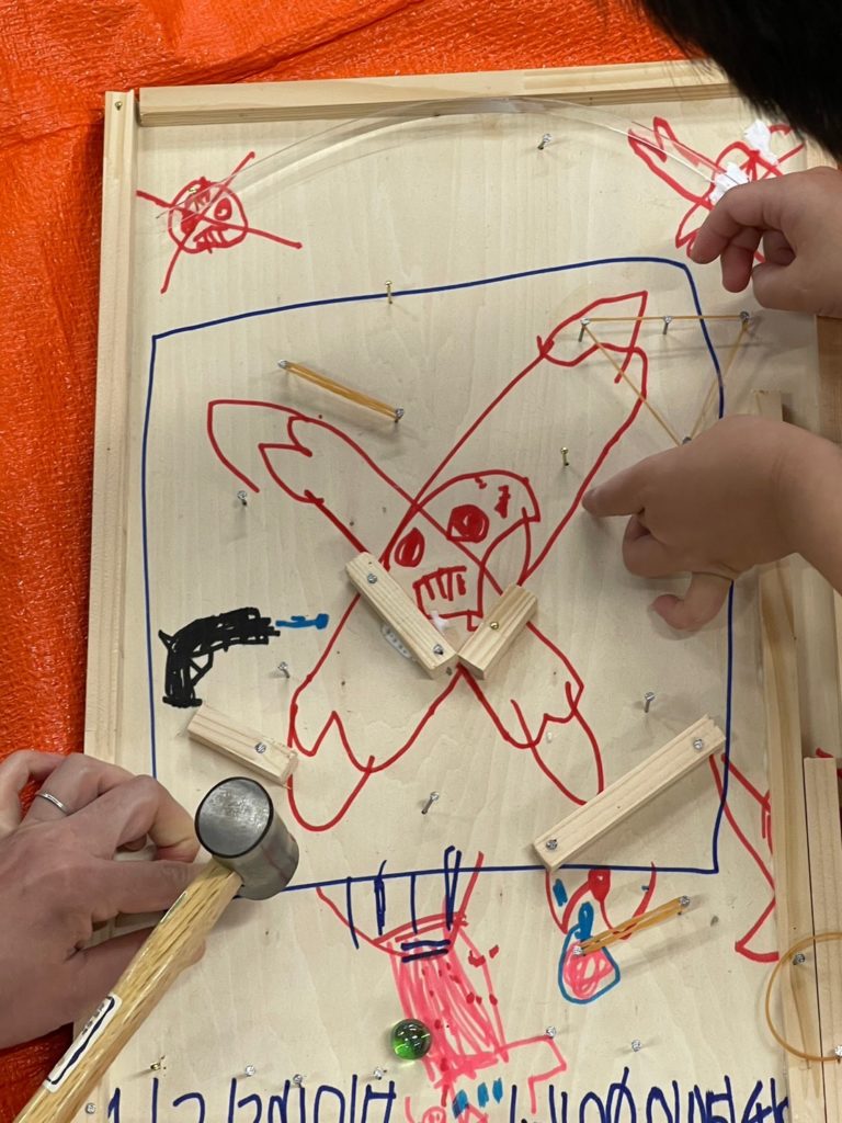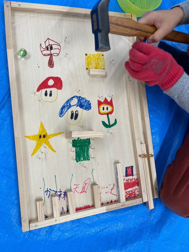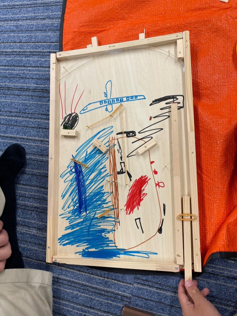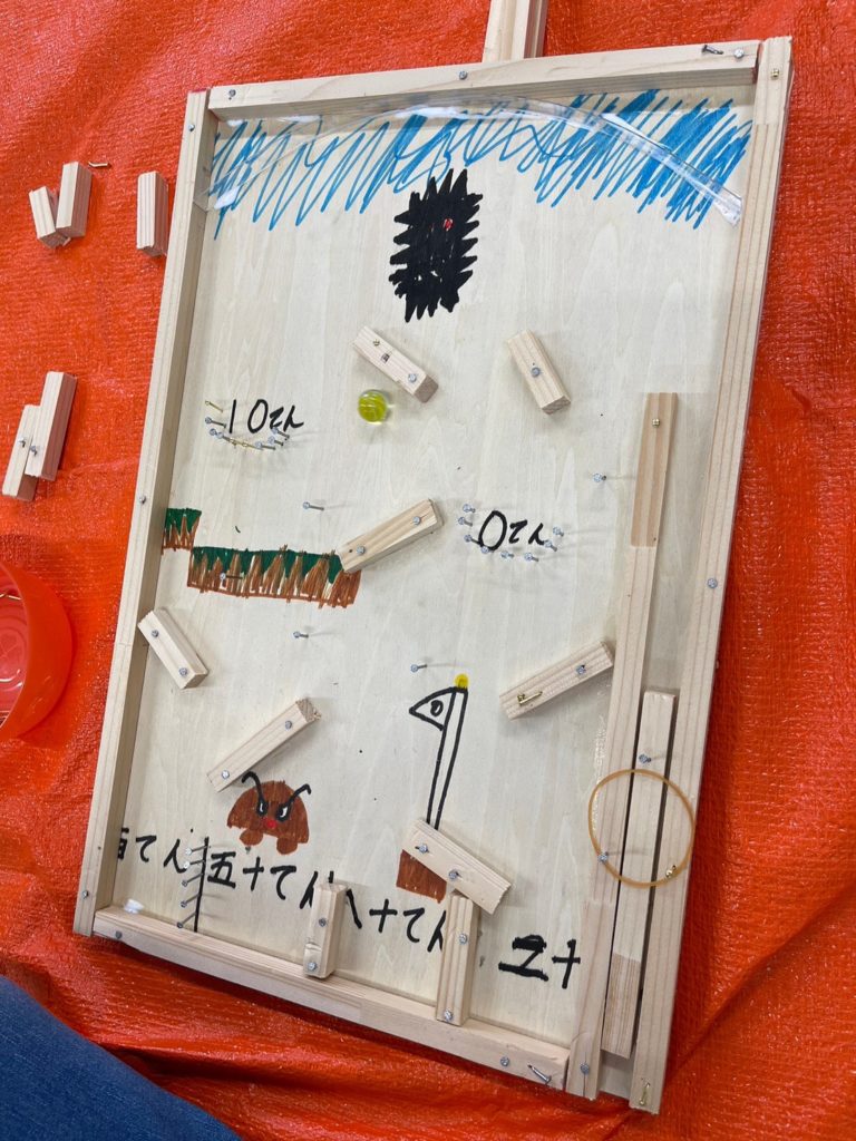 マリオ、マインクラフト、水族館、宇宙、海賊、みんなの世界がスマートボールになったね。ボンドが木から飛び出しちゃったり、釘が曲がっちゃったり、絵が木の枠で少し隠れちゃったり、困ることもあったけど、短い角材や釘や絵を組み合わせて、特徴を活かせたね。